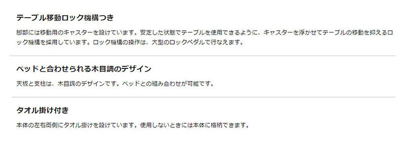 ・板寸法は128.4×40cm。ベッドの上で食事や軽作業が行なえます。テーブルの縁は、優しい感触の軟質ウレタンのエッジを設け、小物が落下しにくいように、テーブル面より少し高くなっています。