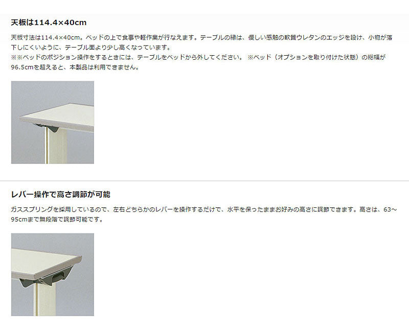 ・板寸法は114.4×40cm。ベッドの上で食事や軽作業が行なえます。テーブルの縁は、優しい感触の軟質ウレタンのエッジを設け、小物が落下しにくいように、テーブル面より少し高くなっています。