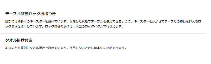 ・脚部には移動用のキャスターを設けています。安定した状態でテーブルを使用できるように、キャスターを浮かせてテーブルの移動を抑えるロック機構を採用しています。ロック機構の操作は、大型のロックペダルで行なえます。