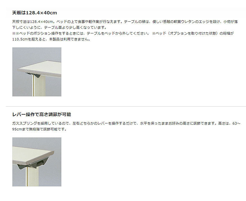 ・板寸法は128.4×40cm。ベッドの上で食事や軽作業が行なえます。テーブルの縁は、優しい感触の軟質ウレタンのエッジを設け、小物が落下しにくいように、テーブル面より少し高くなっています。