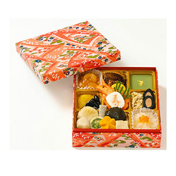 ●おしながき/エビチリソース煮物、やわらか豚角煮、抹茶ムース、きんとん、黒豆、ふわふわ伊達巻、やわらか海老の艶煮、寿かまぼこ、湯葉のちりめん山椒和え、やわらか昆布巻、ほぐし魚の西京焼、里芋六方の煮物、やわらかごぼうの煮物、なごみ巻(ほうれん草)、椎茸しんじょうの煮物、ふんわり高野豆腐、花形人参の煮物、なますゆず風味いくら添え