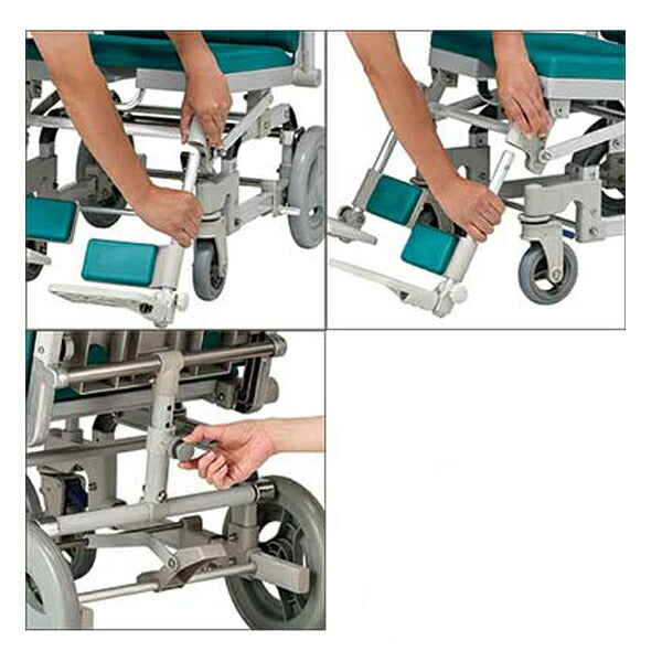 利用者を抱きかかえながら、片手でかんたんにフットレストが取り外せます。
